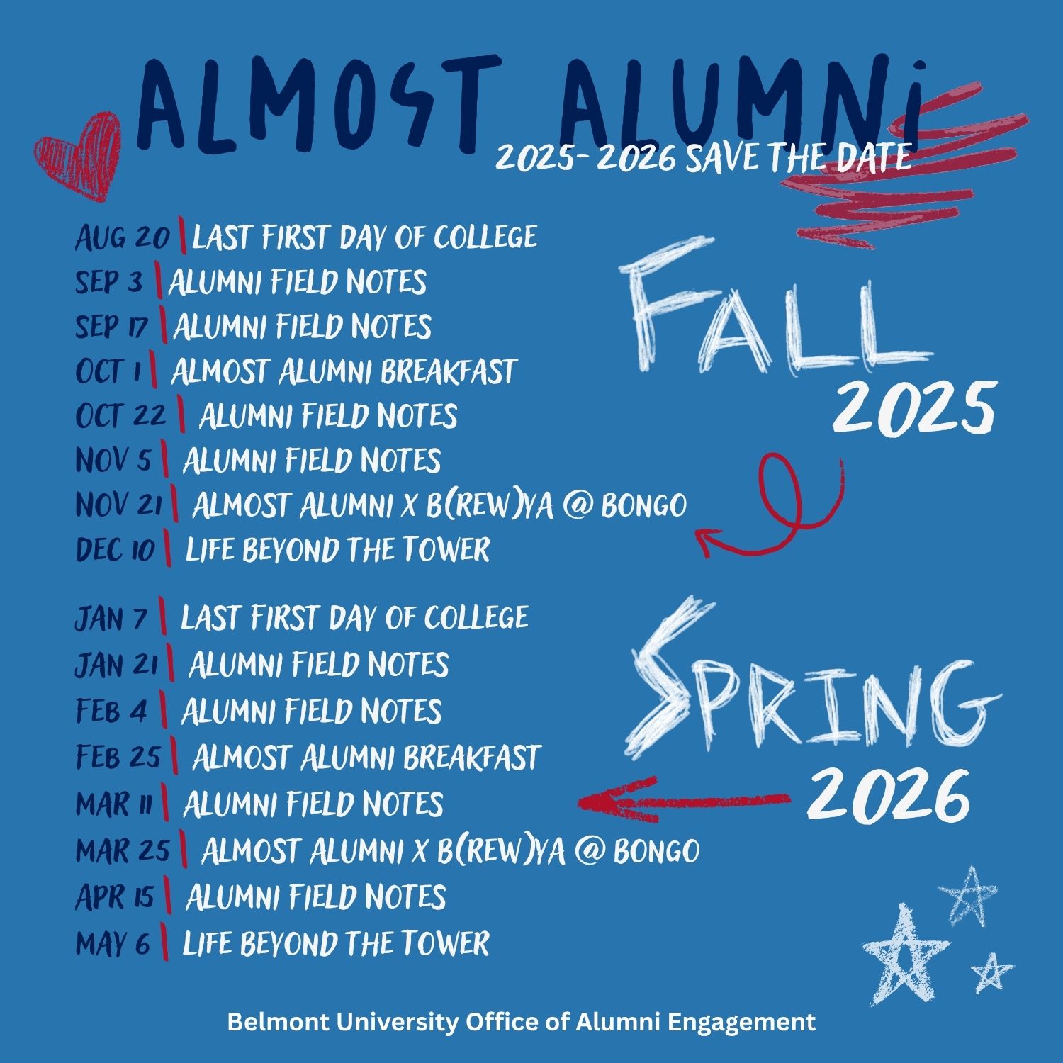 For more information, follow Alumni Engagement on Instagram or reach out to Kaela Buggy (kaela.buggy@belmont.edu).